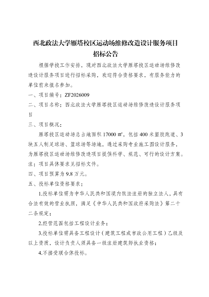 西北政法大学雁塔校区运动场维修改造设计服务项目招标公告