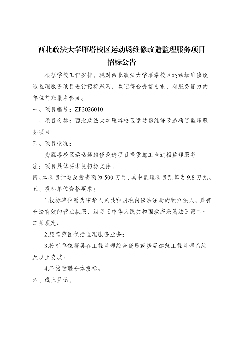 西北政法大学雁塔校区运动场维修改造设计服务项目招标公告