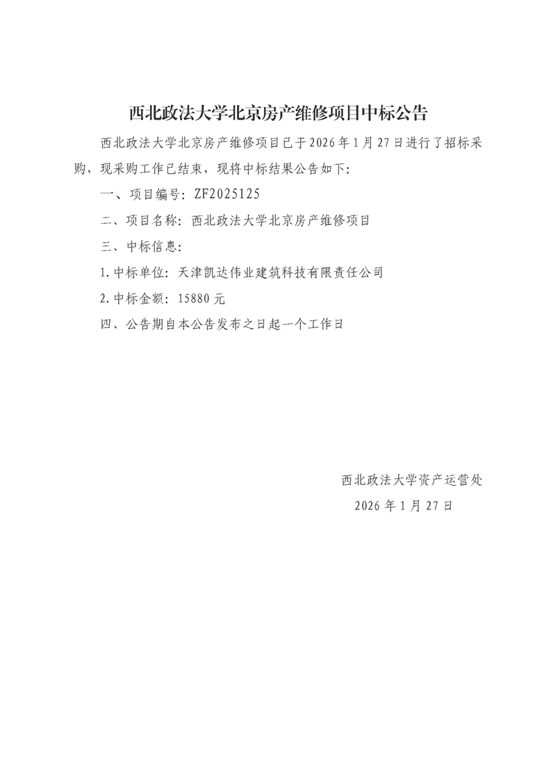 西北政法大学北京房产维修项目中标公告