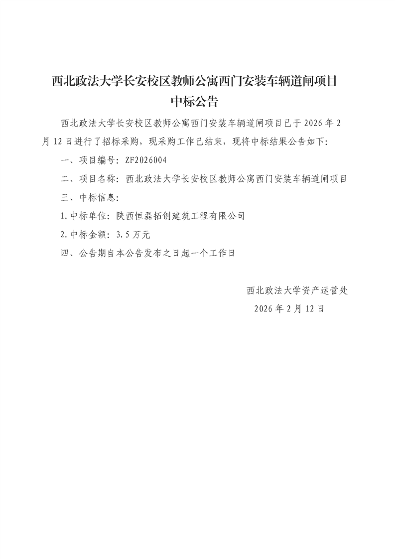 西北政法大学长安校区教师公寓西门安装车辆道闸项目中标公告