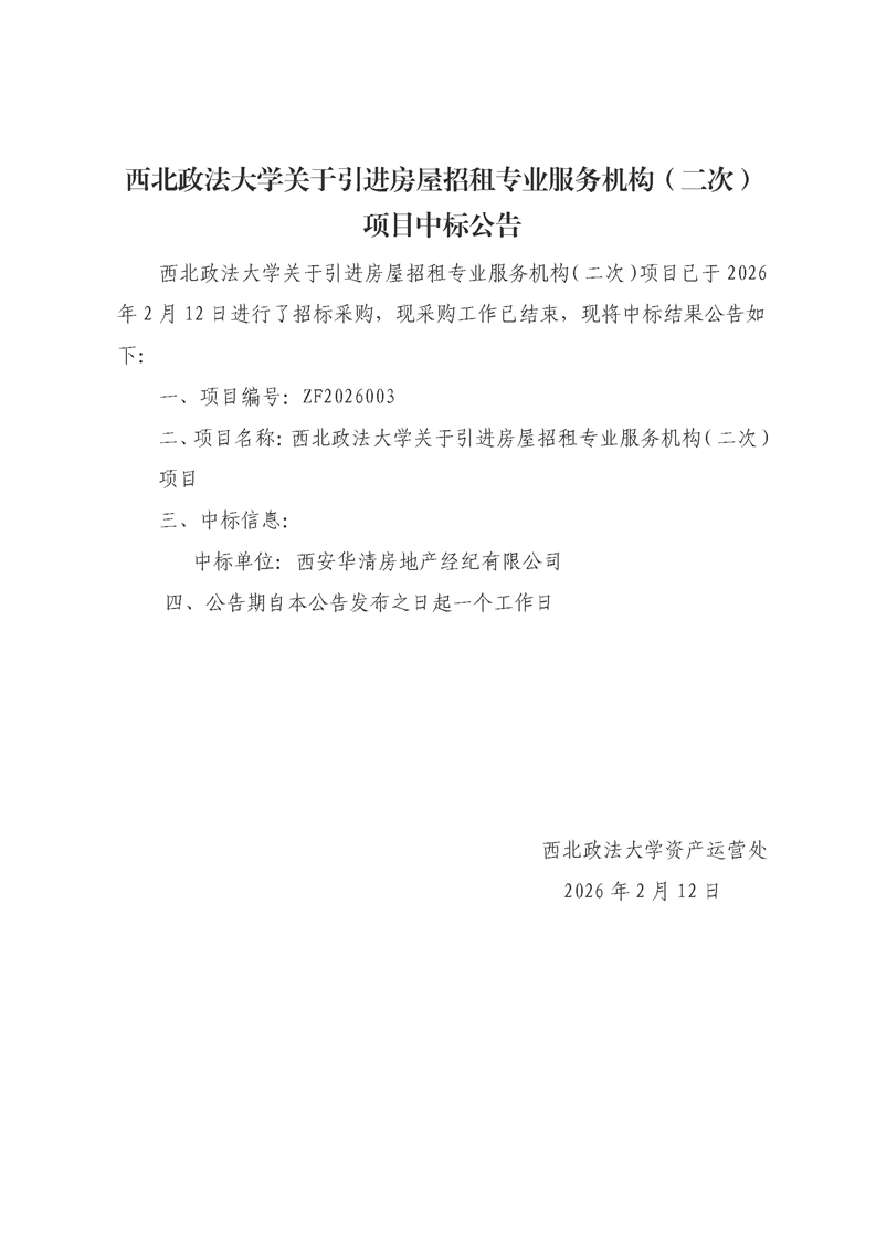西北政法大学关于引进房屋招租专业服务机构(二次)项目中标公告