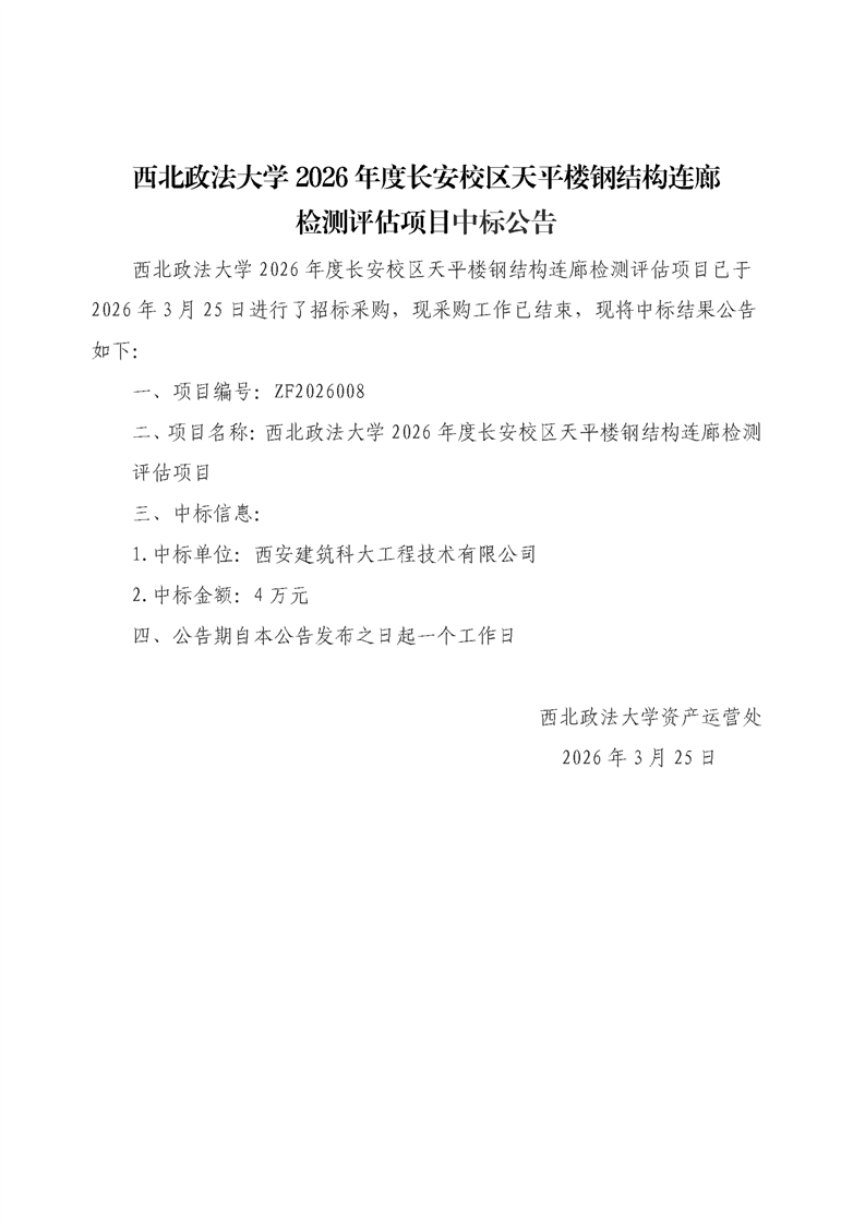 西北政法大学2026年度长安校区天平楼钢结构连廊检测评估项目中标公告