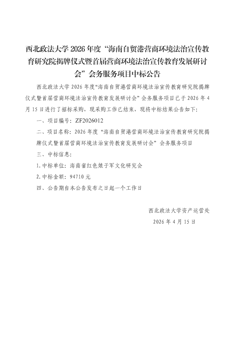 西北政法大学2026年度“海南自贸港营商环境法治宣传教育研究院揭牌仪式暨首届营商环境法治宣传教育发展研讨会”会务服务项目中标公告
